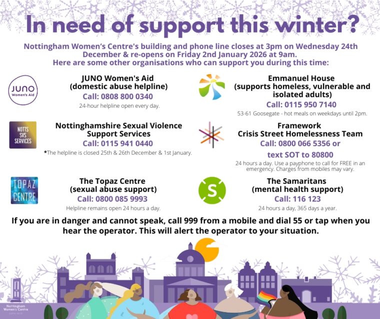 Nottingham Women’s Centre is open Monday to Friday – 9am to 5pm.