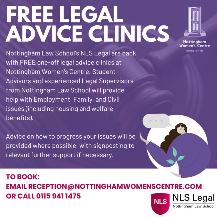 Nottingham Law School’s NLS Legal are back with FREE one-off legal advice clinics at Nottingham Women’s Centre. Student Advisors and experienced Legal Supervisors from Nottingham Law School will provide help with Employment, Family, and Civil issues (including housing and welfare benefits).