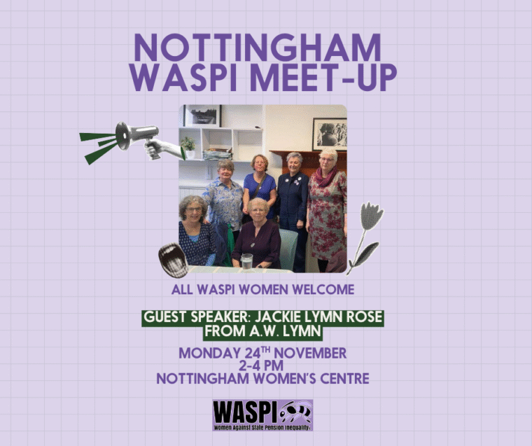 Nottingham WASPI meets every two months at Nottingham Women’s Centre. All women are welcome to join our next meeting on Monday 24 November, 2–4pm.
