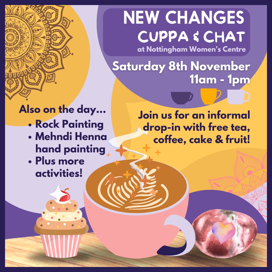 Come along to the New Changes Cuppa & Chat to find out about what’s happening at Nottingham Women’s Centre and to meet the New Changes caseworker team. Drop-in anytime between 11am and 1pm for some free tea, coffee, cake and fruit! There'll also be some fun activities to join in with on the day, including rock painting, Mehndi henna hand painting, and more!